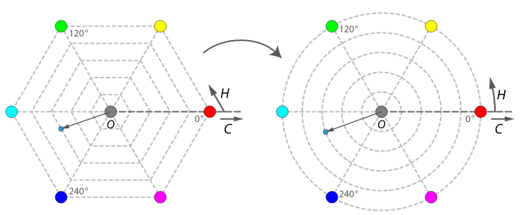 「HSL水平断面図である正六角形」を「0°~360°範囲の値を環状に並べることが可能な正円」へ変形